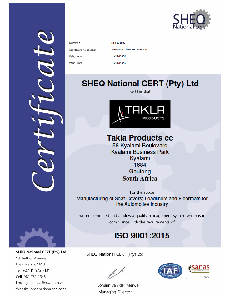 This goes to our unswerving commitment to a continuous quality program, resulting in a better product for our customers. ISO is a compressive management system designed to control every activity of the company. This International certificate is audited annually and is thus kept up to date. Due to the fact that many modern vehicles come with airbags embedded in the seat side any form of cover over the airbag becomes a safety critical issue.